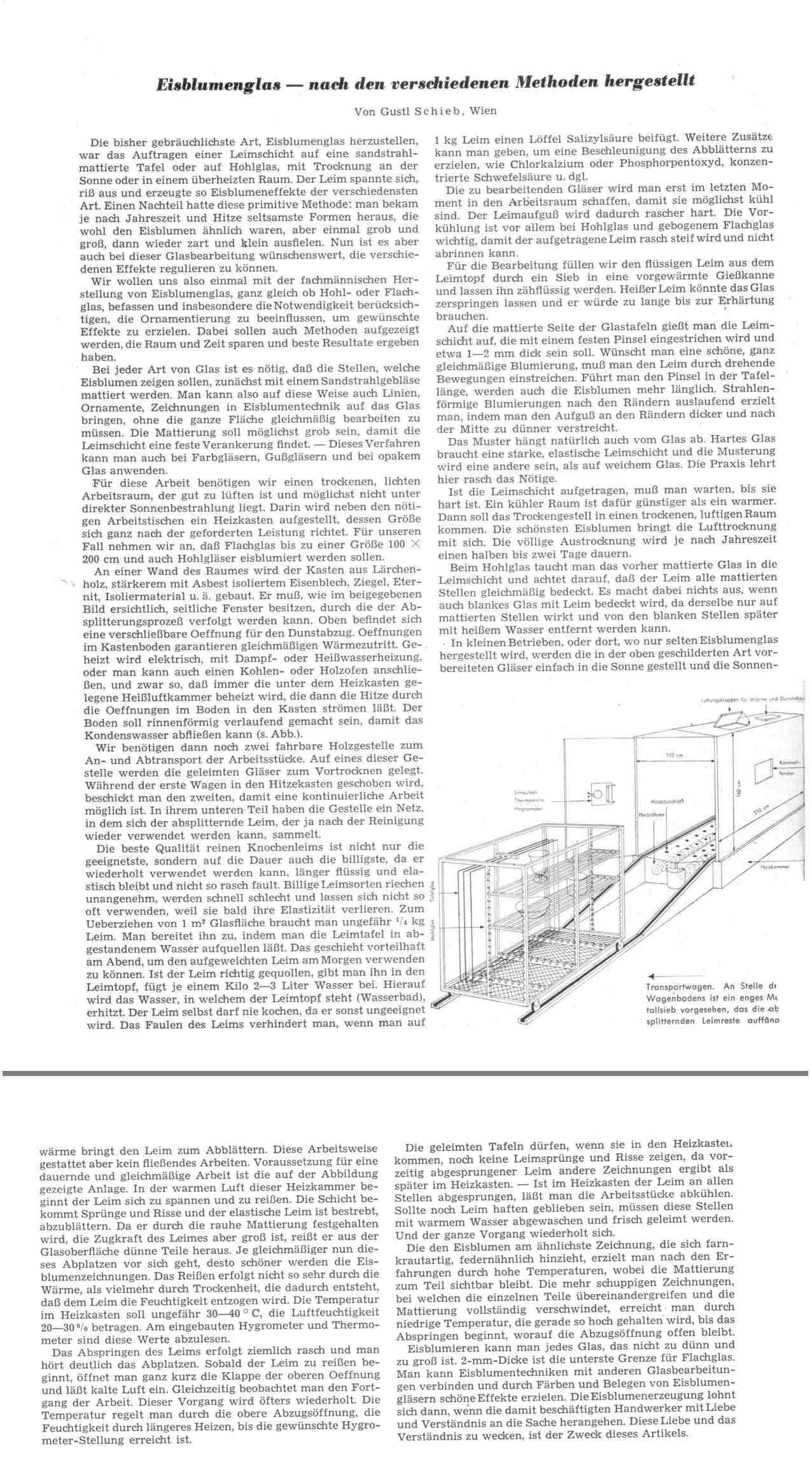 zur Erstellung von Eisblumenglas folgendes: 2 Möglichkeiten sind vorhanden, einmal die Herstellung laut Patent Nr. 24329 des Kaiserlichen Patentamtes von 1883, mit erhitztem Knochenleim auf sandgestrahlte Scheiben, oder laut Patentanmeldung vom 26.01.1959 von Alfred Bulay, Trockenverfahren, wo das Knochengranulat trocken auf gestrahlte Scheiben aufgetragen wird, dann per heißem Wasserdampf erhitzt wird.